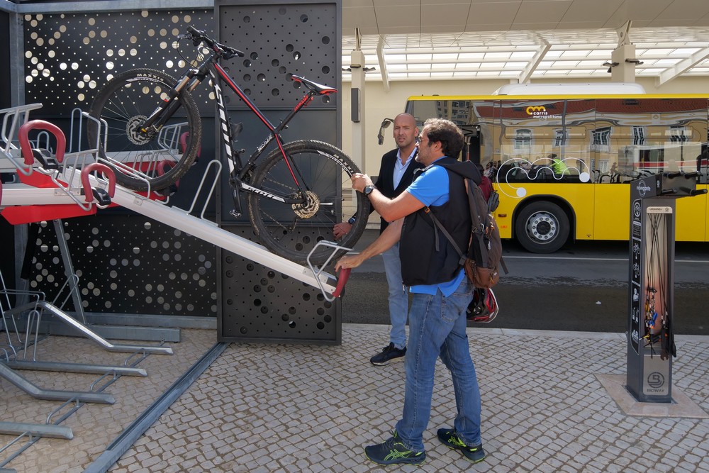 O smarthub, resultante de um investimento partilhado entre a Câmara Municipal de Setúbal e a Transportes Metropolitanos de Lisboa, incorpora vários equipamentos distintos, caso da bicibox, destinada ao parqueamento seguro de bicicletas.