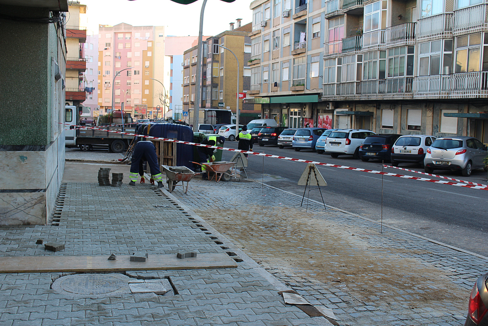 A intervenção em curso consiste na remoção de lajetas em pedra mármore e a sua substituição por blocos de pavê.