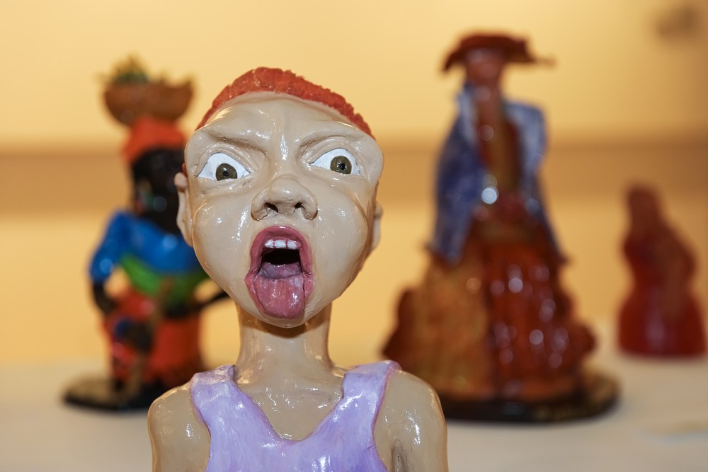 No piso de cima, além de várias telas, destaque para esculturas de barro, algumas pintadas, bem como presépios esculpidos com o mesmo material.