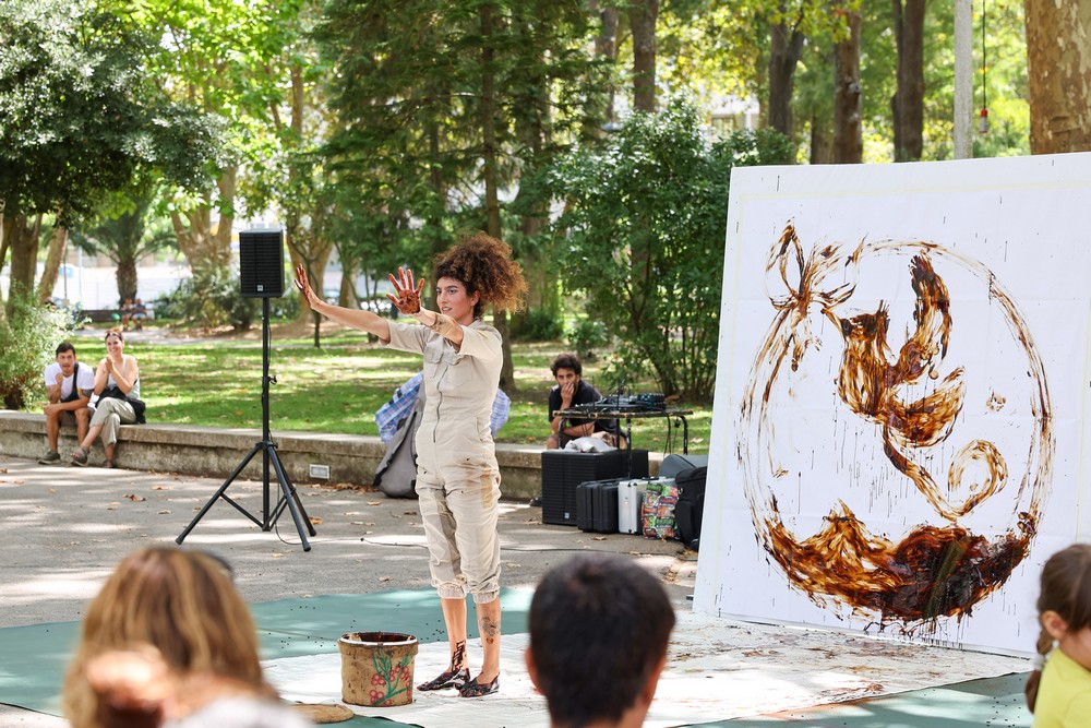 Um dos atrativos, no dia 24, foi “Cafelina”, um poema visual criado com imagens de café ilustrou, de manhã no Jardim do Bonfim e à tarde no Jardim de Palhais, uma tela pintada em movimento com acrobacias dançadas e equilibradas nas mãos, em performance a cargo de Lucía Merlino.