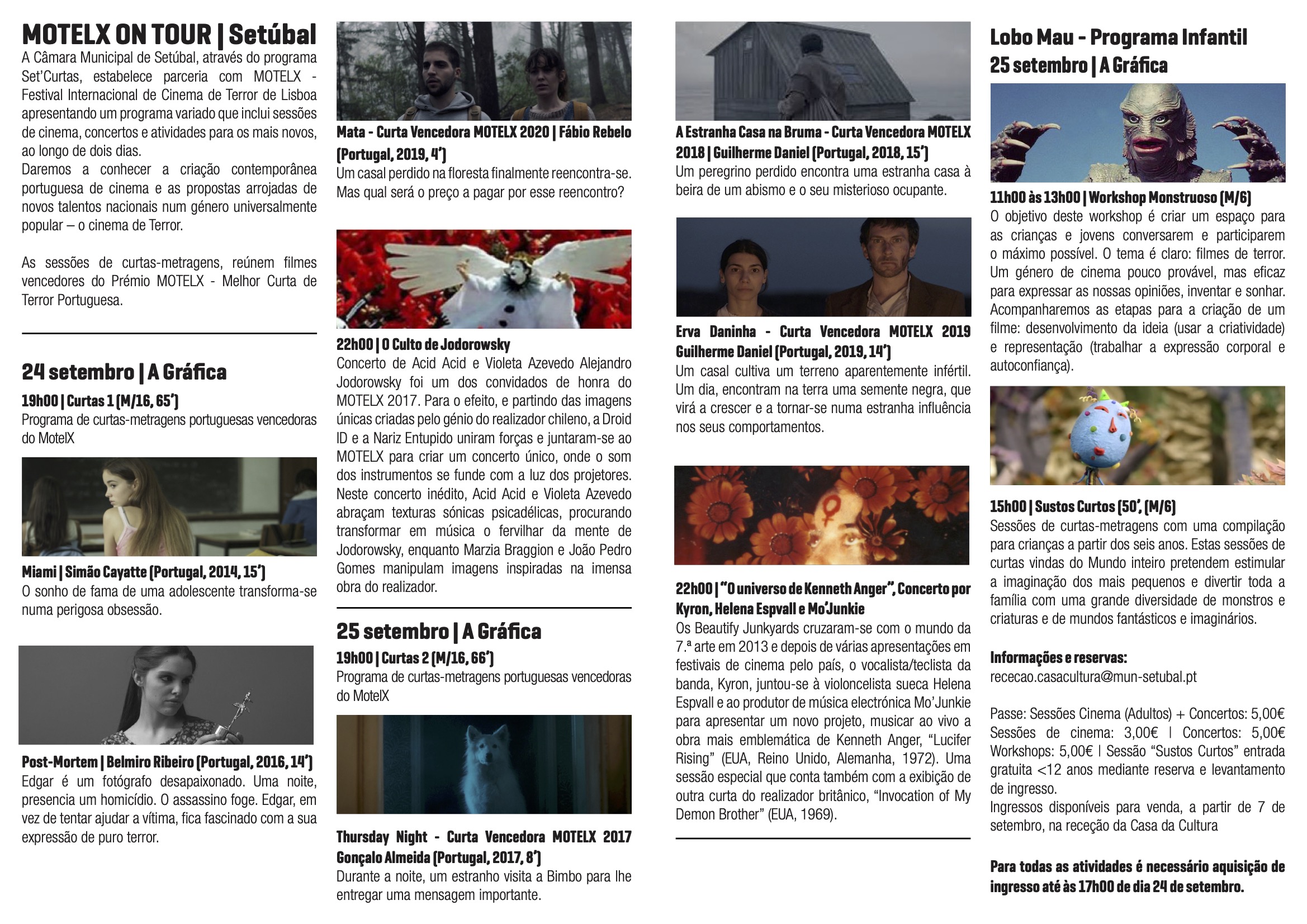 Curtas-metragens portuguesas e estrangeiras, cine-concertos e um workshop para crianças preencheram, nos dias 24 e 25 de setembro, no espaço A Gráfica, a primeira passagem por Setúbal do MOTELX – Festival Internacional de Cinema de Terror de Lisboa.