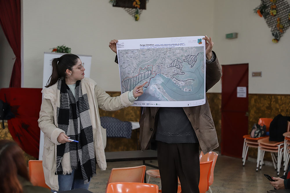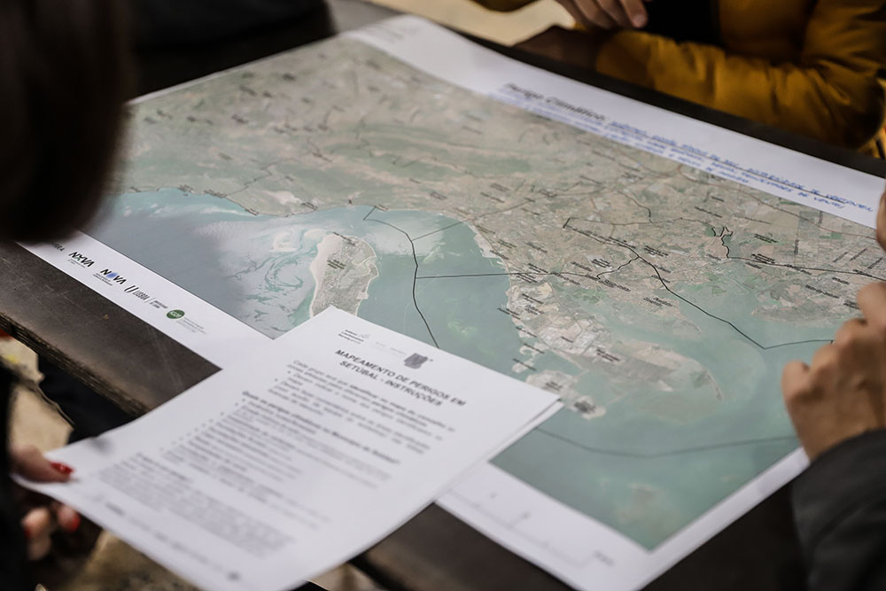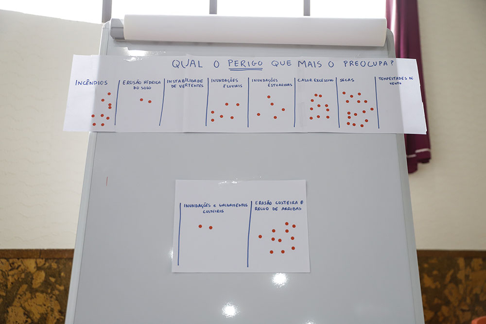 Foram analisados os conhecimentos prévios e a perceção de cada participante dos vários riscos para o território, como incêndios, erosão hídrica do solo, instabilidade de vertentes, inundações fluviais e estuarinas, calor excessivo, seca, tempestades de vento, inundações e galgamentos costeiros, erosão costeira e recuo de arribas.